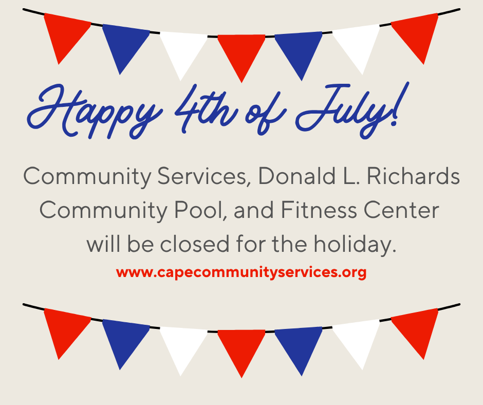 Community Services, Donald L. Richards Community Pool, and Fitness Center will be closed for the holiday. www.capecommunityservices.org